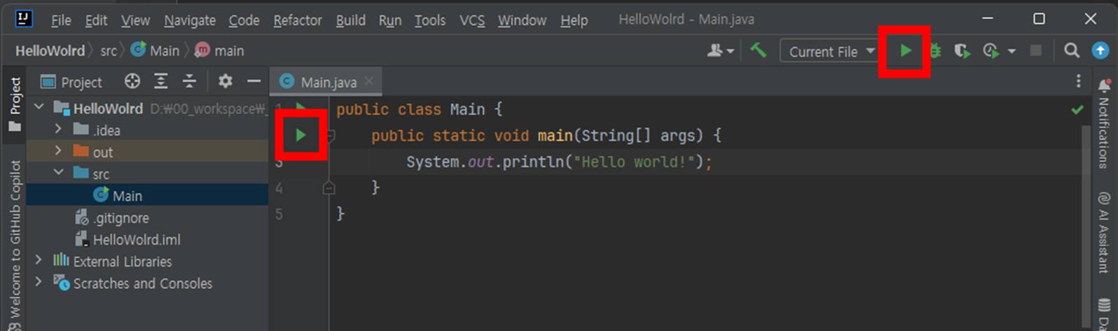 클래스 안에 커서를 두고, 좌측 ▶ 아이콘 또는 상단 Run 버튼을 클릭해보세요